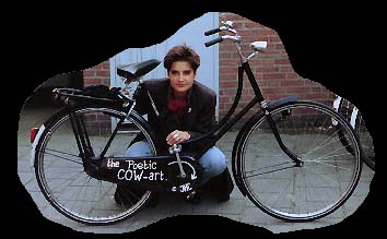Ik kocht deze fiets in 1993, denk ik. Mijn fiets was gestolen achter het hek van het studentenhuis. Een simpele zwarte fiets die me in Tilburg ter dienst stond als student en als werkloze. Ik voelde me een poetisch mens, hield van de eenvoud van koeien, hun schildering en ik hield van kunst. Op die wijze kwam 'the Poetic Cowart' tot stand. Daarna ging de fiets mee naar Amsterdam. En meteen door naar Haarlem (stad van mijn geboortebewijs), waar ik werk vond. Om er mee te fietsen van het centraal station naar de Zijlweg.
